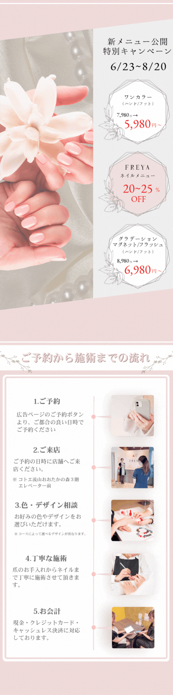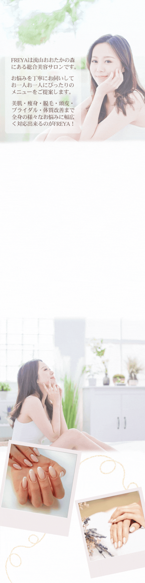 またFREYAのエステティシャンは、技術だけでなく、美容・健康の知識も豊富です。お客様の様々なお悩み・疑問をお伺いし、”美容のプロ”が一緒に解決のお手伝いをさせて頂きます。